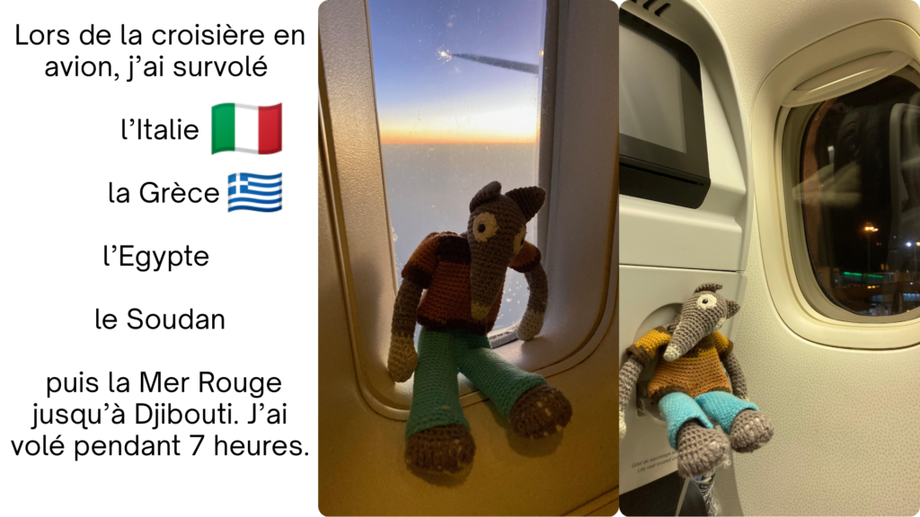 Comme promis, je vous envoie quelques photos de mon voyage de Redon jusqu’à Djibouti . Lors de la croisière en avion, j’ai survolé l’Italie , la Grèce , l’Egypte , le Soudan puis la Mer Rouge jusqu’à Djibouti. J’ai volé pendant 7 heures.